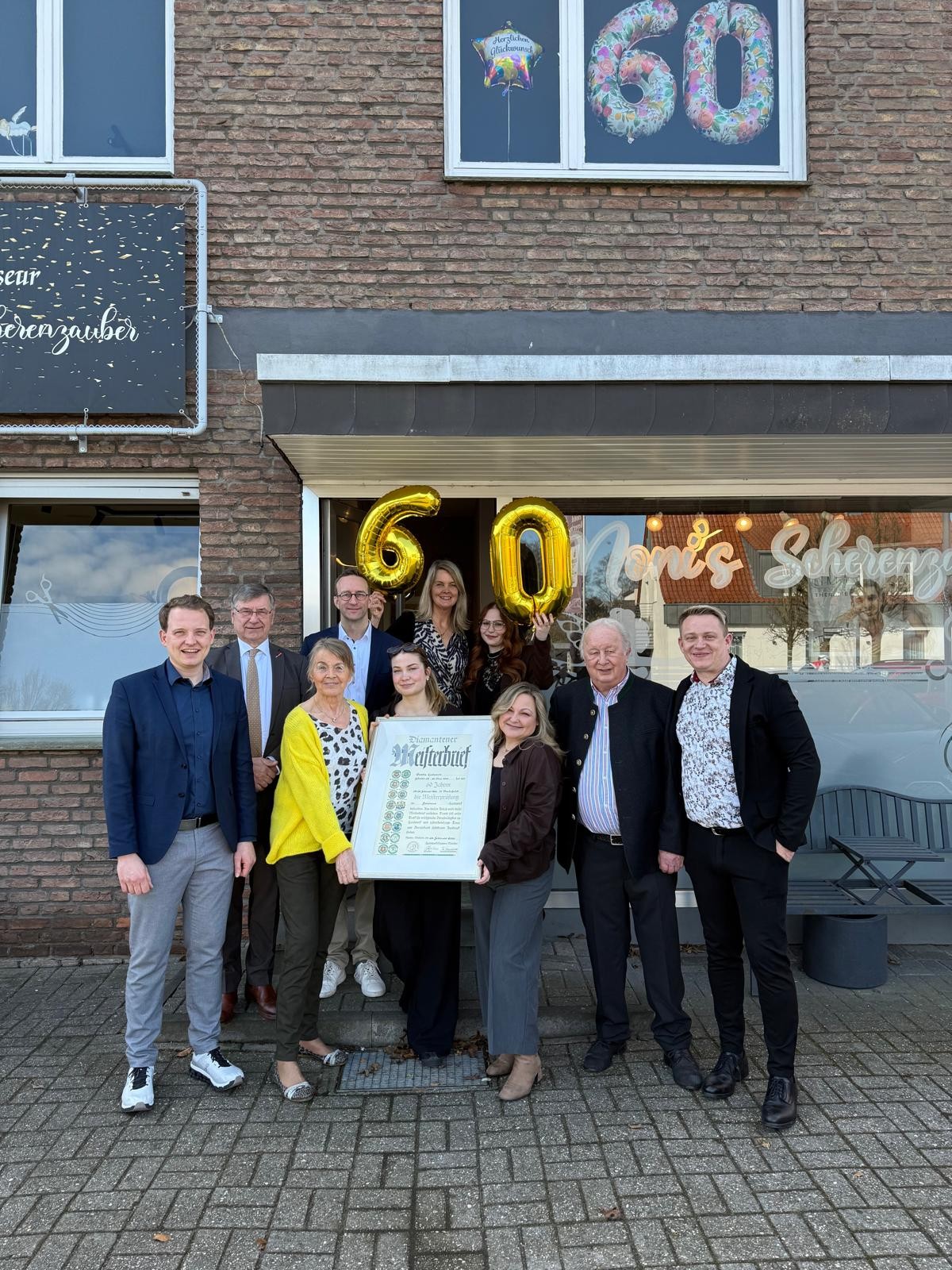 „Was Gerda und Wilhelm Lütjann in den vergangenen 60 Jahren mit Spaß an der Arbeit und ganz viel Herzblut auf die Beine gestellt haben, ist einfach toll!“ Das betonte Bürgermeister Dr. Tom Tenostendarp im Rahmen einer Feierstunde anlässlich der Verleihung des Diamantenen Meisterbriefs im heutigen Salon Moni´s Scherenzauber durch Kreishandwerksmeister Günther Kremer an Gerda Lütjann.