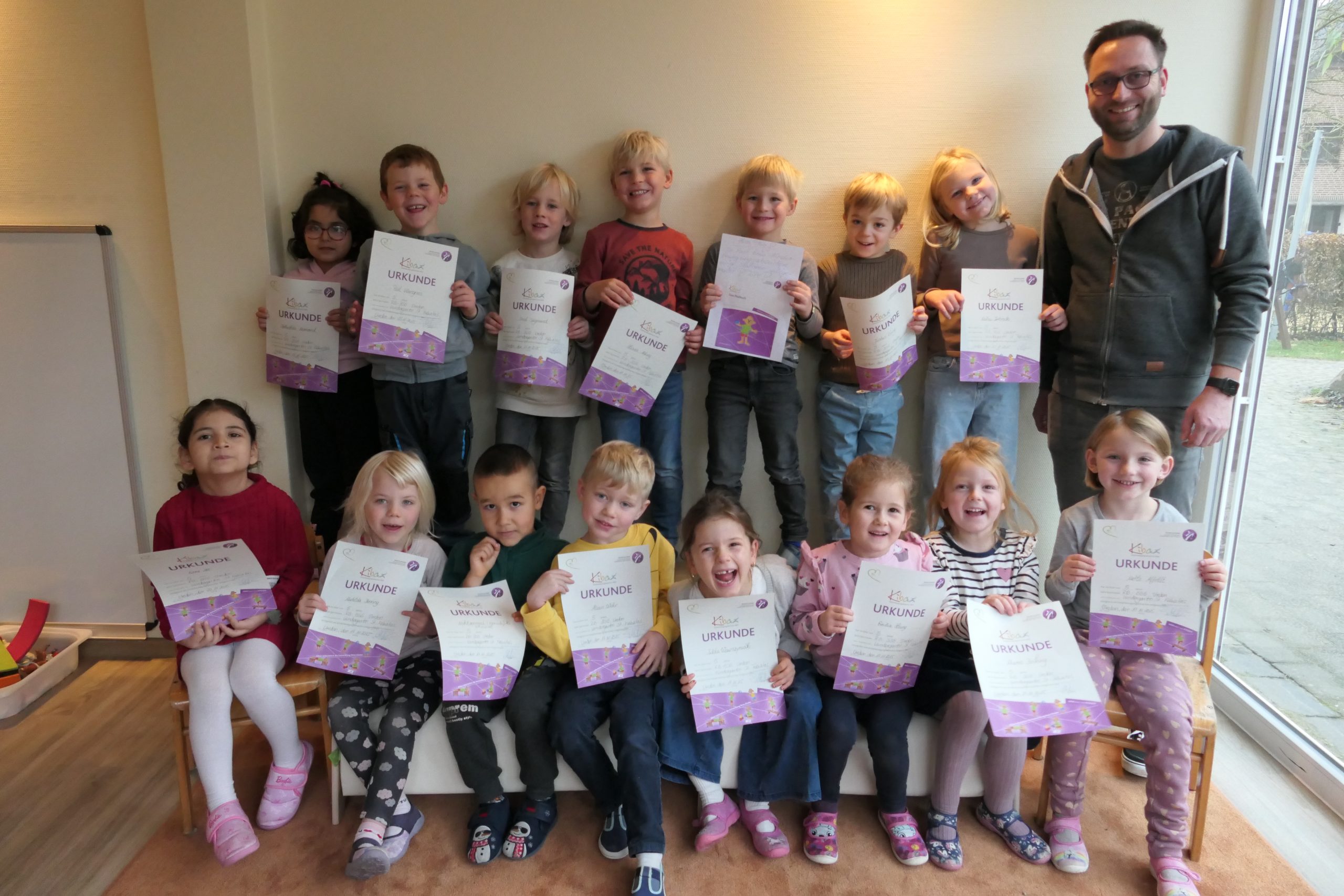 Im November war es wieder so weit: Die „Experten“ des Kindergartens St. Felizitas (Familienzentrum MultiFaz), insgesamt 19 fünf- bis sechsjährige Kinder, stellten ihr Können beim Kinderbewegungsabzeichen (Kibaz) unter Beweis. In Kooperation mit der RB-BSG Vreden durchliefen die jungen Bewegungstalente zehn vielseitige Stationen, an denen unterschiedliche Entwicklungsbereiche spielerisch gefördert wurden. Mit großer Begeisterung und voller Einsatzbereitschaft meisterten die Kinder jede Aufgabe. Unterstützt wurden sie dabei von Anja Voigt von der RB-BSG, die als Übungsleiterin vor Ort war. Am Ende nahmen alle stolz ihre wohlverdienten Urkunden entgegen.
