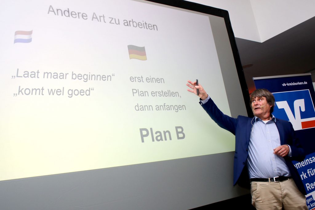 Auf genauso humorvolle wie informative Weise bekamen die 120 Besucher des diesjährigen AgrarForum Westmünsterland am Mittwochabend vor Augen geführt, wie unterschiedlich die Herangehensweisen in der (Land-) Wirtschaft im Vergleich zwischen Niederländern und Deutschen ist. Die Veranstaltergemeinschaft aus Westfälisch-Lippischem Landwirtschaftsverband, Landwirtschaftskammer NRW und den Volksbanken im Kreis Borken hatte – passenderweise nur 4 km von der Grenze entfernt – nach Vreden in die Gaststätte „Zum Dornbusch“ eingeladen. Mit Hauptreferent Dr. Johannes Reef trug ein ausgewiesener Experte für deutsch-niederländische Zusammenarbeit vor. Sozialwissenschaftler Reef hat vor 26 Jahren zusammen mit seinem niederländischen Kompagnon, Frederik Wanink, die Firma DNL-contact gegründet. Die Steinfurter Consulting-Agentur begleitet millionenschwere internationale Kooperationsprojekte – im Schwerpunkt in der deutsch-niederländischen Grenzregion mit Akteuren beiderseits der Grenze. Dabei beobachtet Reef als Brückenbauer immer wieder deutlich unterschiedliche Herangehensweisen. Hier einige Beispiele: