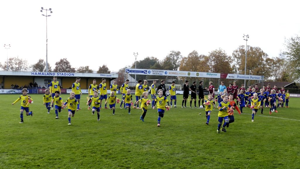Doch damit war der Tag für die Kinder noch lange nicht vorbei: Sie durften beim Oberligaspiel SpVgg Vreden gegen Arminia Bielefeld II als Einlaufkinder mitwirken. Ein echtes Highlight! Besonders beeindruckend war die Anreise der Gäste im offiziellen Mannschaftsbus der ersten Mannschaft von Arminia Bielefeld.