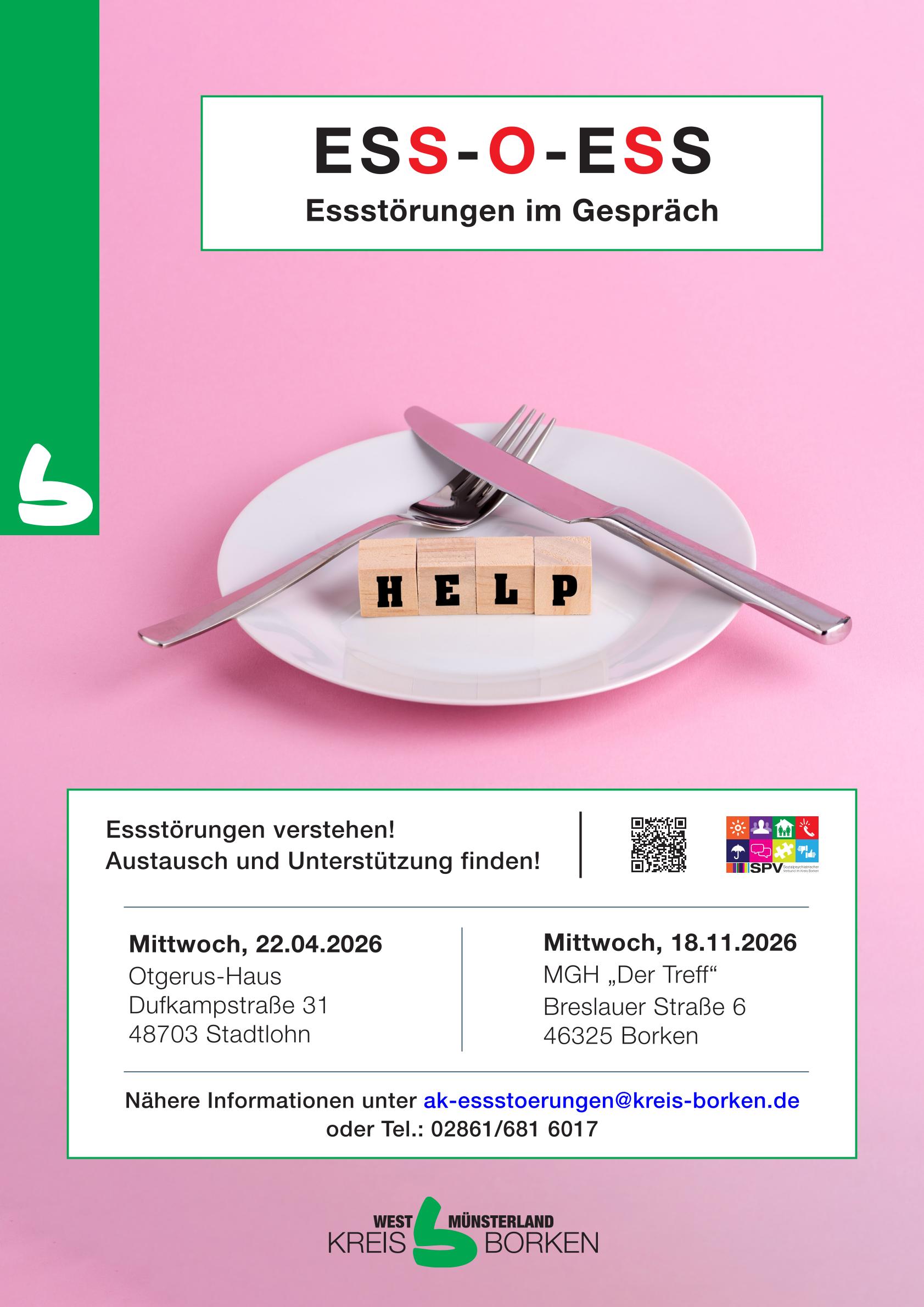 „ESS-O-ESS – Essstörungen im Gespräch“: Der Arbeitskreis Essstörungen im Kreis Borken lädt in größeren zeitlichen Abständen Betroffene, Angehörige, Interessierte und auch Fachleute ein, in ungezwungener Atmosphäre über das Thema zu sprechen. Am Mittwoch, dem 22. April 2026, findet dazu wieder ein Informations- und Austauschcafé „ESS-O-ESS Essstörungen verstehen! Austausch und Unterstützung finden!“ in der Zeit von 18.00 bis 20.00 Uhr im Otgerus-Haus in Stadtlohn (Dufkampstraße 31) statt.