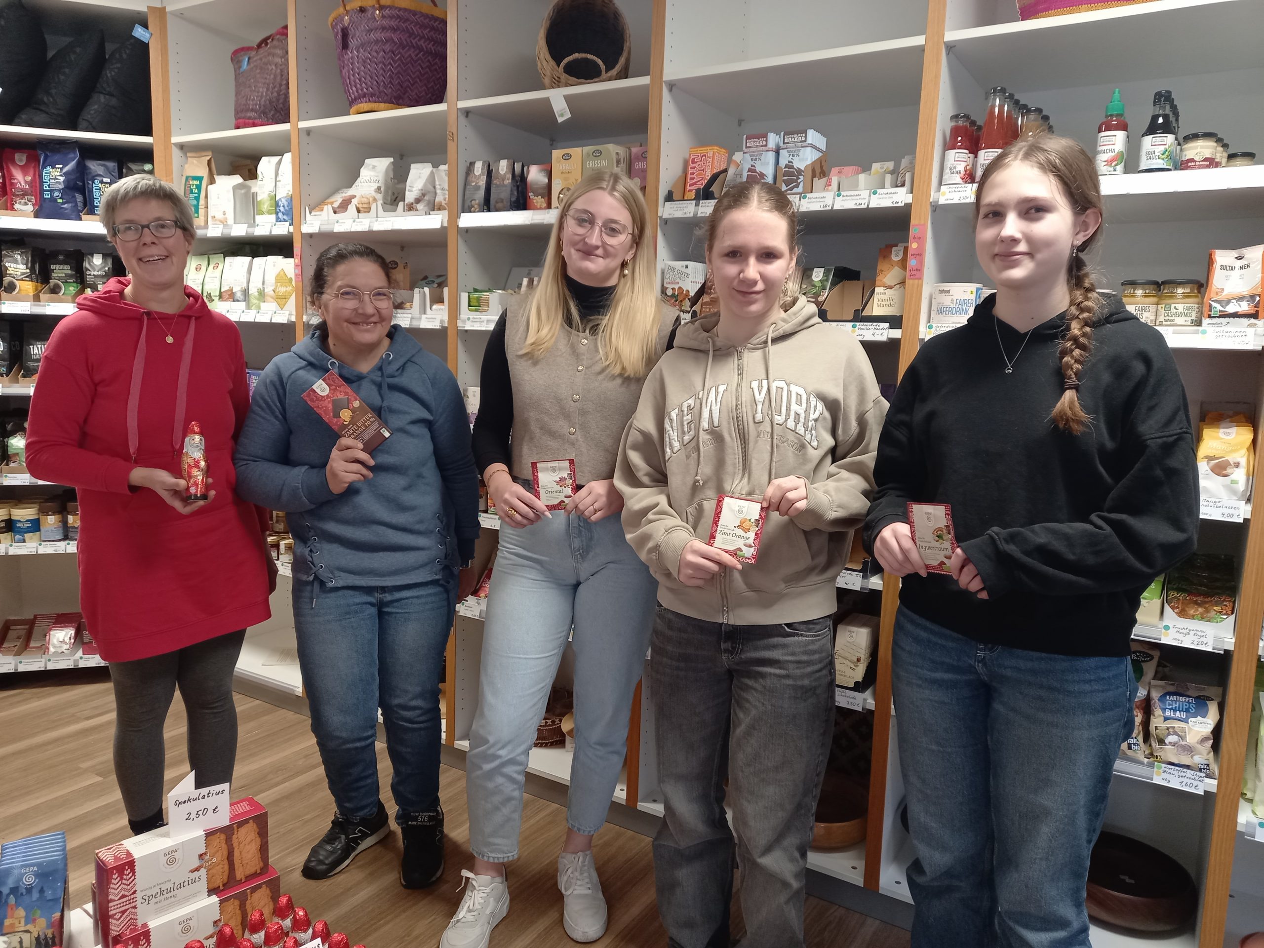 Im Rahmen ihrer Firmvorbereitung machten sich drei jugendliche Firmbewerberinnen mit ihrer Firmbegleiterin Jamy Esseling auf den Weg in den Weltladen. Hier wurden sie von den ehrenamtlichen Mitarbeiterinnen Katrin Bruland und Sonja Terhechte und von Monika van Beek (Eine-Welt-Kreis Vreden e.V.) zum Gespräch empfangen: Was bedeutet eigentlich Fairer Handel insbesondere für Kinder und Jugendliche in den Ländern des Südens und deren Zukunft? Was ist die Besonderheit eines Weltladens? Was macht der Eine-Welt-Kreis? Und welche Bedeutung haben die von ihm unterstützten Partnerprojekte in Brasilien und Simbabwe für Kinder und Jugendliche? Kann ich mich selber auch bei diesen ehrenamtlichen Tätigkeiten einbringen? … Schade, dass die Gesprächszeit so schnell vorbei war!