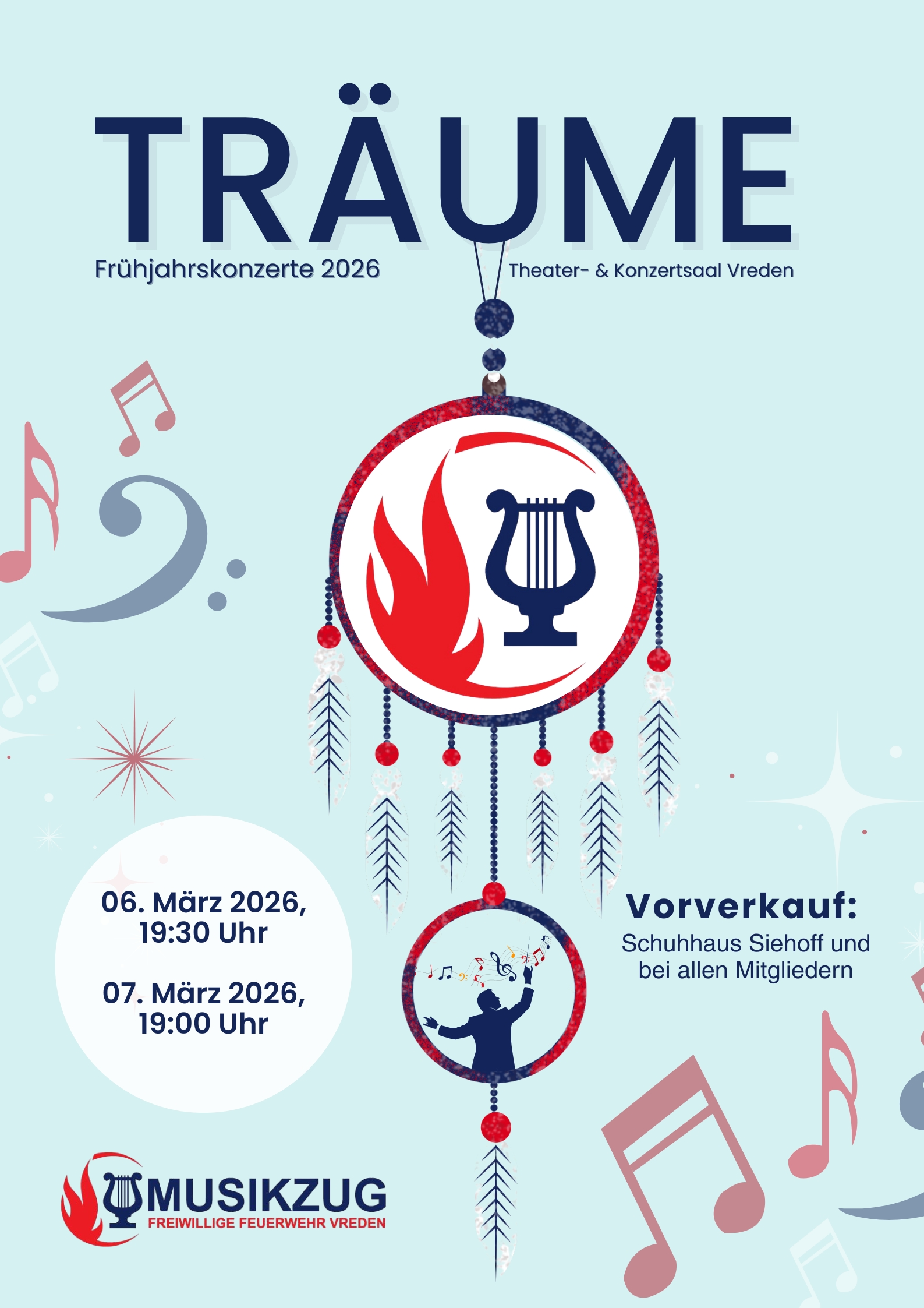 Der Musikzug der Freiwilligen Feuerwehr präsentiert im nächsten Jahr wieder das alljährliche Frühjahrskonzert im März 2026 unter dem Motto „Träume“. Das Jugendblasorchester (JBO) sowie das Hauptorchester wird sie durch die verschiedensten Träume führen und den Konzertabend ganz der Vielfältigkeit der Blasmusik widmen. Noch auf der Suche nach einem Geschenk? Das Konzert, findet am Freitag, dem 6.März 2026 und Samstag, dem 7. März 2026 statt. Beginn ist am Freitagabend um 19.30 Uhr und am Samstagabend um 19.00 Uhr, der Einlass startet 30 Minuten vor Beginn. Die Karten sind für 13,00 € beim Schuhhaus Siehoff und allen Mitgliedern ab dem 18. Dezember 2025 erhältlich. Wir freuen uns auf Ihren/Euren Besuch.