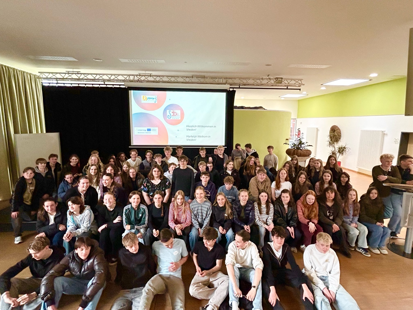 Am 20. April 2026 durfte die Sekundarschule an der Berkel 50 Schüler*innen des Gerrit Komrij College aus Winterswijk begrüßen. Gemeinsam mit 30 Schüler*innen unserer Schule stand der Tag ganz im Zeichen des Austauschs, des Kennenlernens und der grenzüberschreitenden Begegnung. Zu Beginn sorgten verschiedene Kennenlernspiele für eine lockere und offene Atmosphäre. Im Anschluss führten unsere Schüler*innen ihre Gäste in Kleingruppen durch das Schulgebäude und gaben dabei Einblicke in den Schulalltag sowie das Leben an unserer Schule. Ein besonderes Highlight des Tages war die anschließende Schnitzeljagd durch die Vredener Innenstadt. In gemischten deutsch-niederländischen Gruppen erkundeten die Teilnehmenden die Stadt, lösten gemeinsam Aufgaben und stellten dabei Teamgeist und Kreativität unter Beweis. Dabei wurde nicht nur die Umgebung besser kennengelernt, sondern auch die Zusammenarbeit über Sprachgrenzen hinweg gestärkt. Den gelungenen Abschluss bildete ein gemeinsames Pizzaessen, bei dem alle noch einmal in entspannter Runde zusammenkamen und die Erlebnisse des Austausches Revue passieren ließen. Am frühen Nachmittag traten die niederländischen Gäste schließlich ihre Rückfahrt an – ganz traditionell und passend zur niederländischen Fahrradkultur mit dem Fahrrad. Der Austausch wurde im Rahmen des Kleinprojektefonds im Interreg VI-Programm Deutschland-Nederland gefördert. Für diese Unterstützung möchten wir uns herzlich bedanken. Der Besuch war für alle Beteiligten eine bereichernde Erfahrung und zeigte einmal mehr, wie wertvoll persönliche Begegnungen für das gegenseitige Verständnis und die europäische Gemeinschaft sind.