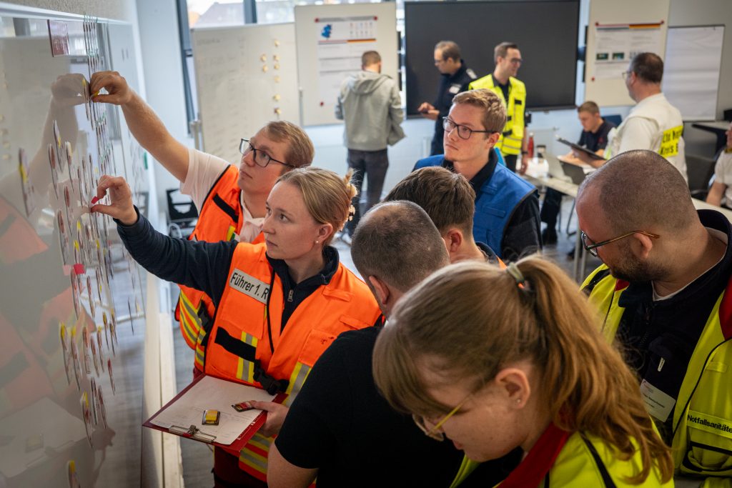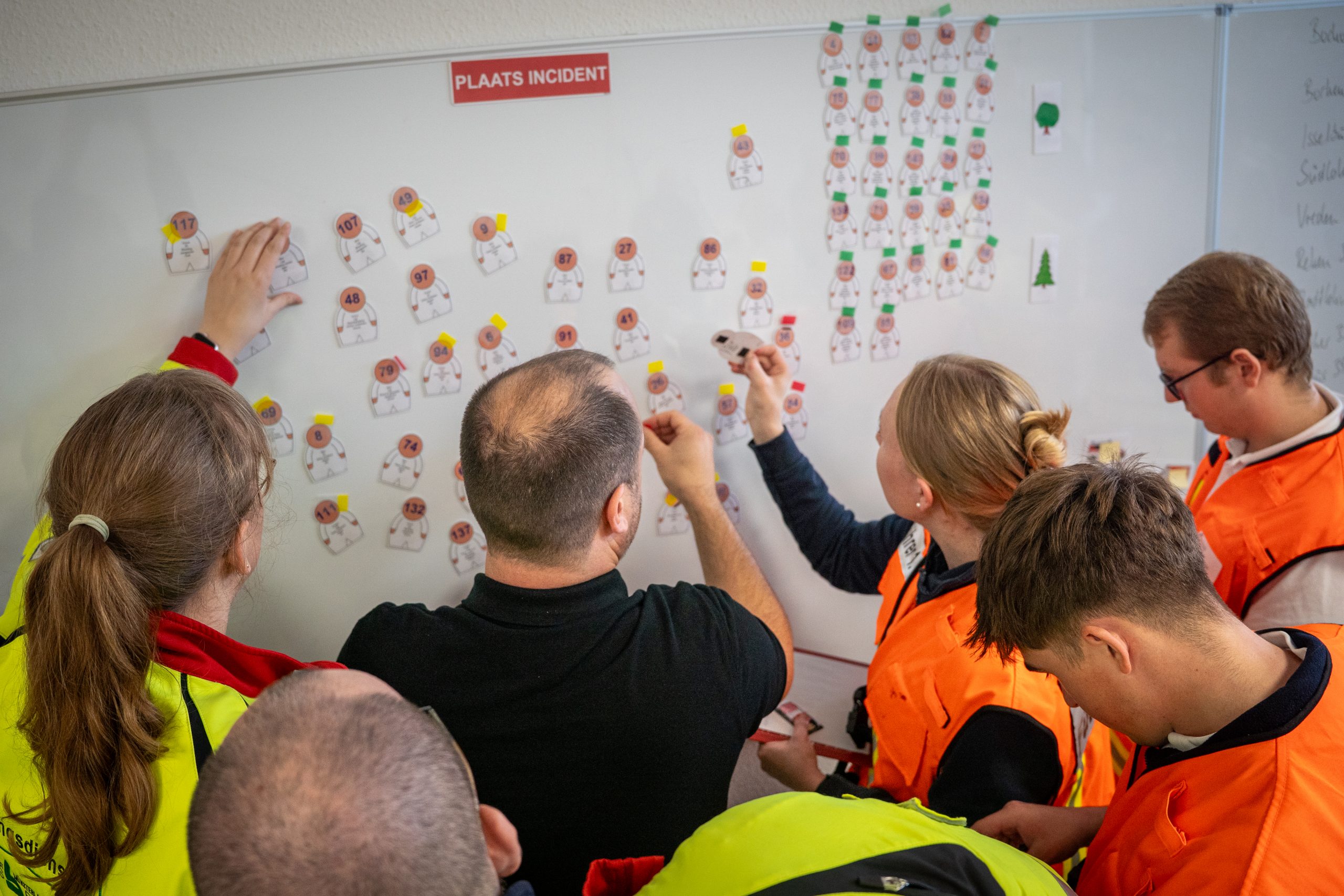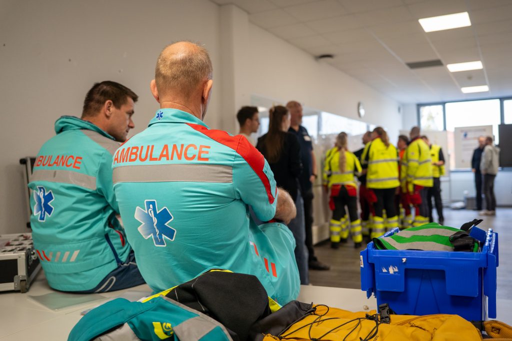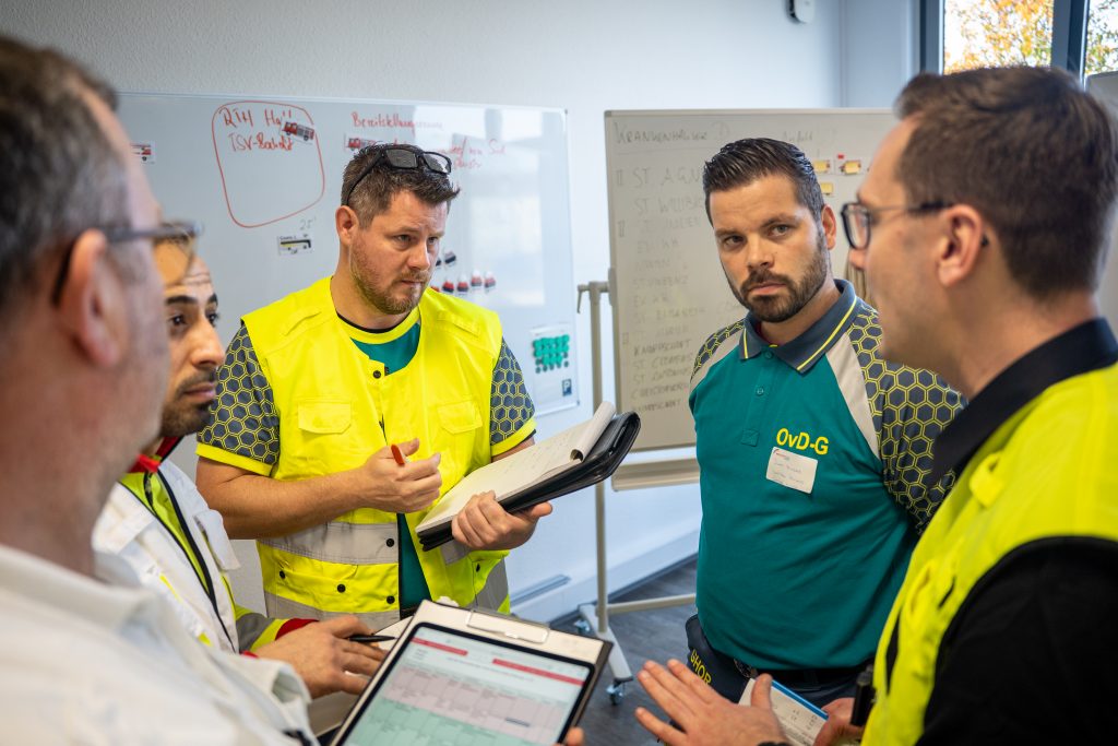 „Bühneneinsturz auf einer Musikveranstaltung mit circa 120 Betroffenen“ – so lautete die fiktive Einsatzmeldung im Rahmen der grenzüberschreitenden „Emergo Train System“-Übung (ETS), die jetzt mit rund 60 Teilnehmerinnen und Teilnehmern in den Räumlichkeiten der Feuerwehr- und Rettungsdienstakademie in Bocholt stattgefunden hat. ETS ist ein Simulationstool, das im Katastrophenschutz- und Krisentraining eingesetzt wird. „Ziel der Übung war es, die grenzüberschreitende Zusammenarbeit zwischen niederländischen und deutschen Rettungsdiensten sowie den Krankenhäusern bei einem Ereignis mit vielen Verletzten, Erkrankten und Betroffenen zu verbessern“, erklärt Florian Laubrock von der Fachabteilung Gefahrenabwehr des Kreises Borken, der die Übung seitens der Kreisverwaltung mit organisiert hatte.