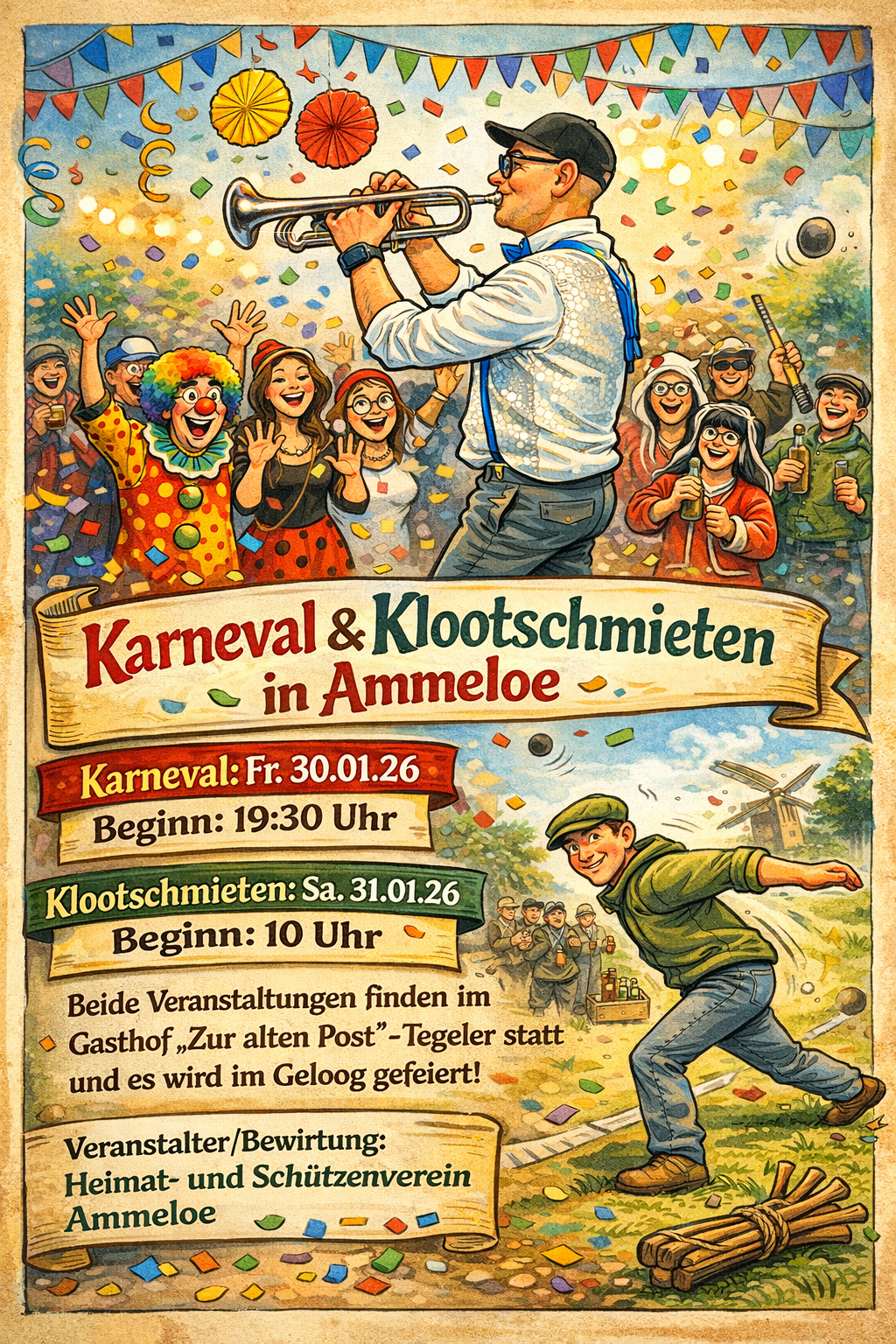 Wir, vom Heimat- und Schützenverein Ammeloe, laden alle Feierlustigen und Freunde der Tradition zu einem geselligen Wochenende im Gasthof „Zur alten Post“ Tegeler ein. Gefeiert wird an beiden Tagen im Geloog, wo Gemeinschaft und gute Stimmung im Mittelpunkt stehen. Am Freitag, dem 30. Januar 2026 starten wir um 19.30 Uhr mit unserer Karnevalsparty. In fröhlicher Runde möchten wir gemeinsam lachen, tanzen und einen ausgelassenen Abend verbringen – selbstverständlich in bester Karnevalsstimmung. Am Samstag, dem 31. Januar 2026 treffen sich dann alle Mitglieder vom HSA um 10.00 Uhr zum traditionellen Klootschmieten. Dieser beliebte Brauchtum bietet Gelegenheit zusammen aktiv zu sein und den Tag in geselliger Atmosphäre zu genießen. Für die Veranstaltung und Bewirtung sorgen wir als Heimat- und Schützenverein Ammeloe selbst und freuen uns auf viele bekannte Gesichter, nette Gespräche und ein rundum gelungenes Wochenende.