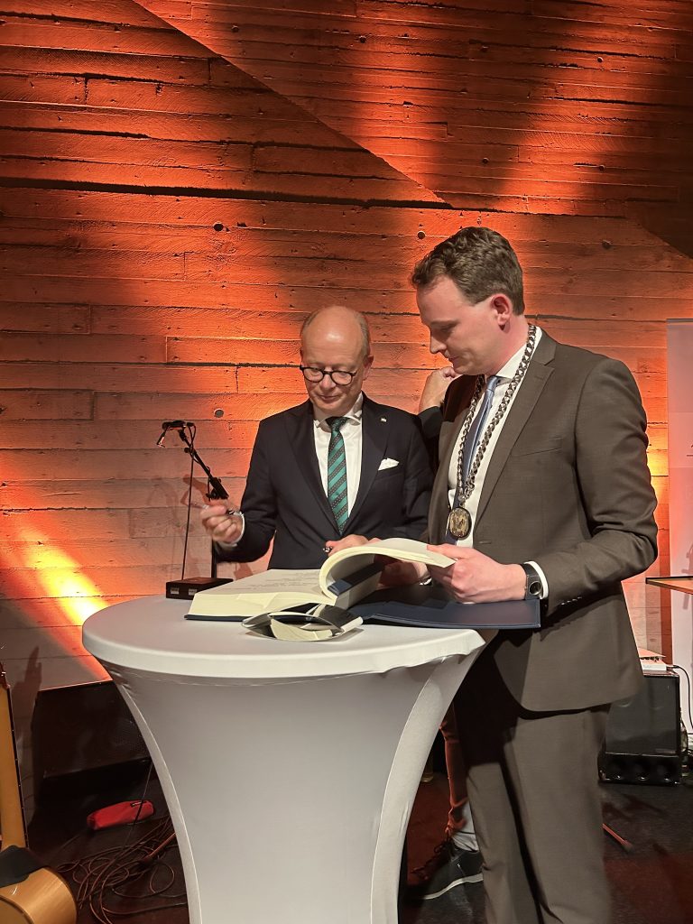 Landtagspräsident André Kuper (links) trug sich in das Goldene Buch der Stadt Vreden ein.