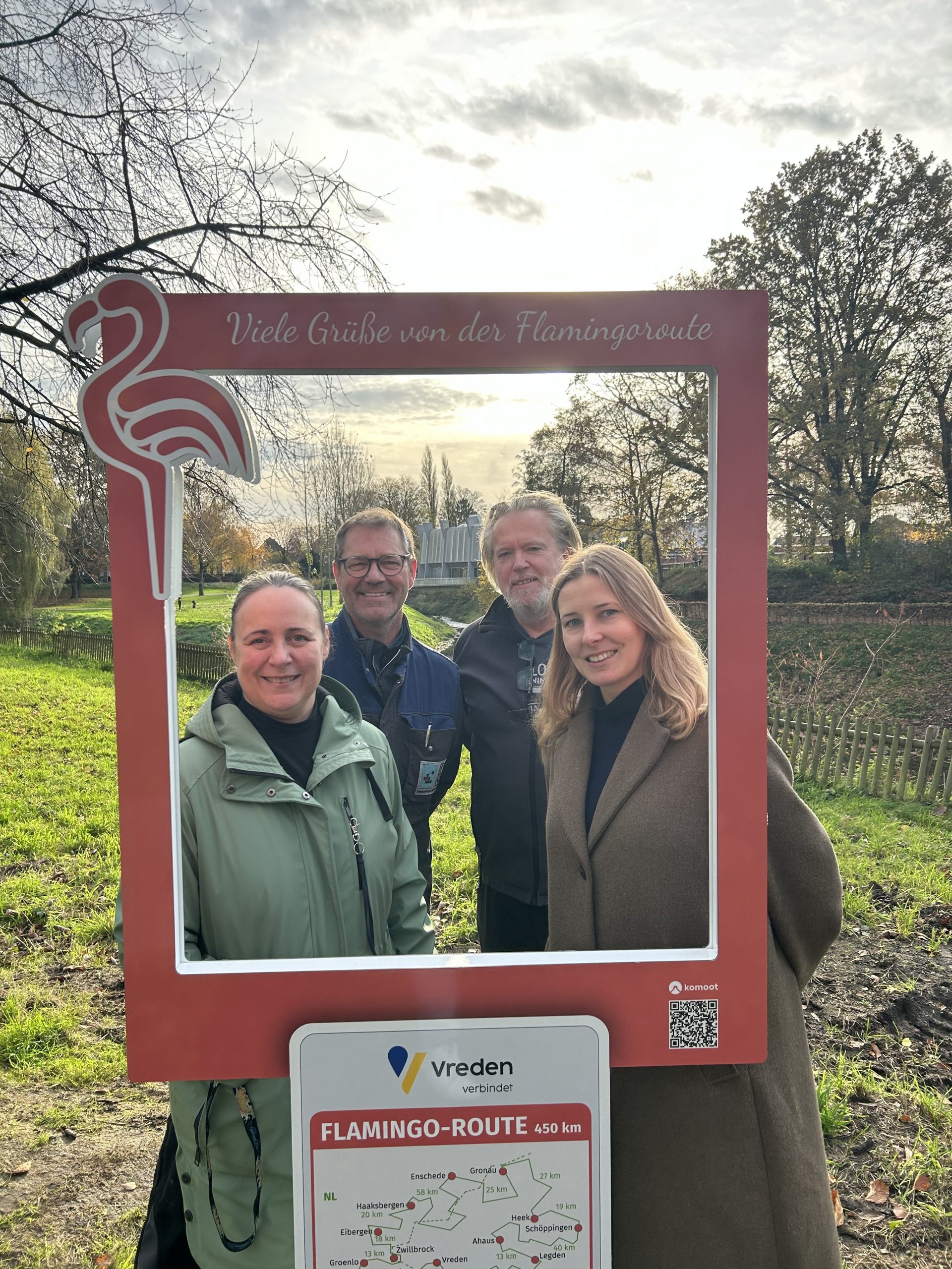 Auf der beliebten Flamingoroute gibt es ein weiteres Highlight: Im Vredener Stadtpark, direkt an der Berkelbrücke, lädt seit Neuestem ein neuer Flamingo-Fotopoint die Radfahrerinnen und Radfahrer dazu ein, eine kleine Pause einzulegen und ein Erinnerungsfoto zu machen.