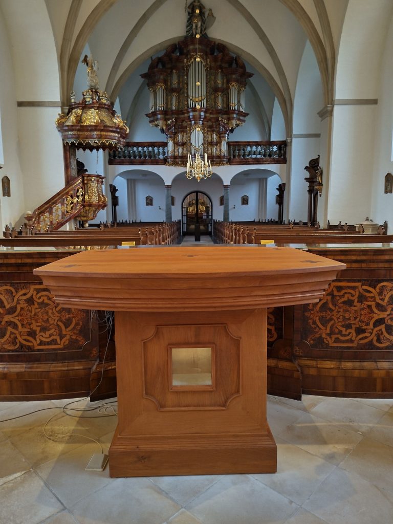 Mit der Aufstellung des Altars ist das Projekt allerdings noch nicht abgeschlossen. In seinem Unterbau ist eine Nische, die durch eine Glasscheibe verschlossen ist. Für diese Nische wurde von Herrn Weidenfeller ein kleiner Holzschrein angefertigt, der dann vom Goldschmiedemeister Norbert van Ooyen mit Messing eingefasst wurde. Das Kästchen enthält Reliquien der heiligen Elisabeth, der heiligen Ursula und des heiligen Gereon sowie des heiligen Petrus Chanel.