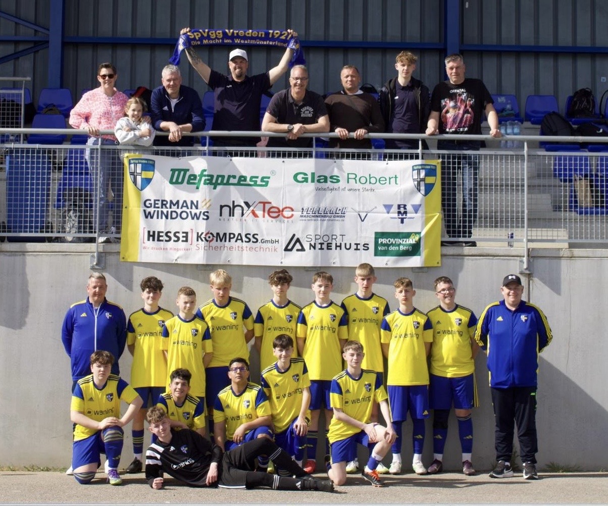 Zusammen mit der U15 der JSG Vreden-Südlohn-Oeding ging es für die C3 der SpVgg Vreden in den Osterferien Richtung Süden. Mit einer tollen Eröffnungsfeier startete für die Mannschaften das Abenteuer Trofeo Mediterraneo 2026 an der Costa Brava. Beim feierlichen Einmarsch der Teams – ganz im Stil der Olympischen Spiele – erlebten die jungen Spieler einen ersten emotionalen Höhepunkt, der die besondere Atmosphäre des internationalen Turniers unterstrich. Sportlich traf das Team aus der Kreisliga C in der Gruppenphase auf spielstarke Gegner und stellte sich der Herausforderung mit großem Einsatz und bemerkenswertem Teamgeist. Gegen den Landesligisten Delbrücker SC musste sich die C3 ebenso geschlagen geben wie gegen die Fußball Akademie Albanien, die ihre technische und taktische Klasse ausspielte. Besonders hervorzuheben ist die Leistung im Spiel gegen SC Werden-Heidhausen. In einer intensiven Partie hielt die Mannschaft lange auf Augenhöhe mit und überzeugte durch großen Kampfgeist. Trotz eines starken Auftritts endete die Begegnung mit einer 0:2-Niederlage, womit die SpVgg Vreden C3 nach der Gruppenphase aus dem Turnier ausschied. Neben den sportlichen Herausforderungen sammelten die Spieler auch abseits des Platzes wertvolle Eindrücke. Ein besonderes Highlight war der Ausflug in die spanische Metropole Barcelona mit dem Besuch des Stadions Camp Nou und des Museums des FC Barcelona. Zudem wurde der Teamgeist bei einem gemeinsamen Laser-Combat-Ausflug weiter gestärkt, bei dem der Spaß klar im Vordergrund stand. Den gelungenen Abschluss des Turniers bildete schließlich eine stimmungsvolle Abschlussfeier mit einem eindrucksvollen Feuerwerk, das die erlebnisreichen Tage bei der Trofeo Mediterraneo abrundete und den Spielern noch lange in Erinnerung bleiben wird. Ein herzliches Dankeschön an die Sponsoren die uns unterstützt haben: Wefapress, Glas Robert, German Windows, nhXTec, RMT, Terbrack Maschinenbau, Hesse, Kompass Sicherheitstechnik, Sport Niehuis, Provinzial van den Berg und Tenhumberg Haustechnik.
