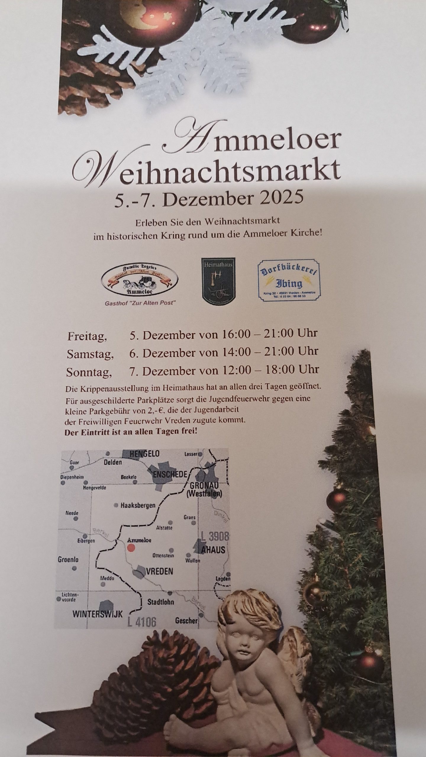 Offiziell eröffnet wird der Ammeloer Weihnachtsmarkt am Freitag, dem 5. Dezember 2025, um 19.00 Uhr durch Bürgermeister Dr. Tom Tenostendarp. An drei Tagen lädt der Markt große und kleine Besucher zu entspannten Stunden im Herzen des historischen Dorfkerns ein.