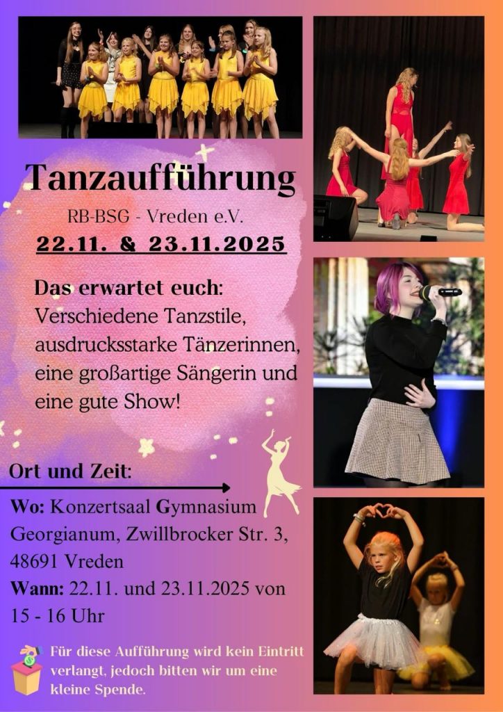 Am 22 und 23 November 2025 dürfen sich Tanz- und Musikliebhaber freuen: Von 15.00 bis 16.00 Uhr findet eine Tanzaufführung im Gymnasium Georgianum in Vreden statt. In dieser zeigen die Tanzgruppen des RB-BSG, unter Leitung von Christina Wessels, wie Hip Hop- und Contemporary-Tänze auf moderne, energiegeladene Songs treffen. Die Tänzerinnen präsentieren abwechslungsreiche Choreografien, die Emotion und Rhythmus vereinen. Für ein besonderes musikalisches Erlebnis sorgt außerdem Maria Geneviéve Jourdain die die Aufführung mit ihrem wunderschönen Gesang begleitet. Der Eintritt ist frei, jedoch ist eine kleine Spende gerne willkommen. Ein Ereignis, das man nicht verpassen sollte – voller Bewegung, Musik und Leidenschaft!