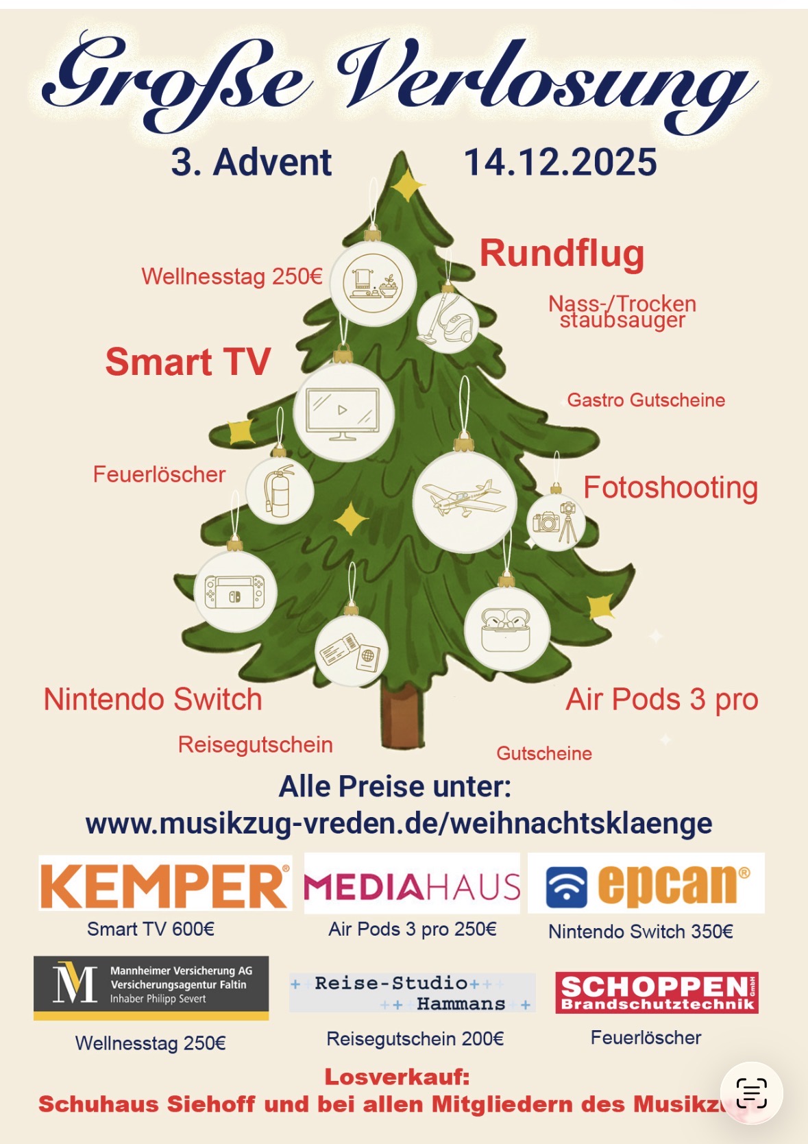 Der Musikzug der Freiwilligen Feuerwehr Vreden lädt am Sonntag, dem 14. Dezember 2025 (3. Advent), von 11.00 bis 18.00 Uhr herzlich zum traditionellen Adventsevent „Weihnachtsklänge“ ein. Rund um den Proberaum am Bauhof erwartet Besucher ein stimmungsvolles Programm mit Live-Musik, kulinarischen Angeboten und weihnachtlicher Atmosphäre. Im Mittelpunkt der Veranstaltung steht in diesem Jahr die große Tombola. Als besonderen Hauptgewinn verlost der Musikzug einen spektakulären Rundflug über Vreden. Darüber hinaus können sich die Teilnehmer auf zahlreiche hochwertige Sachpreise freuen – darunter Wellness-Angebote, moderne Technik-Gadgets und sogar ein Smart TV. Alle Preise sind auf der Veranstaltungsseite ausführlich aufgeführt. Mit dem Kauf eines Loses unterstützen Besucher direkt die Jugendarbeit des Musikzuges. Die Lose sind ab sofort bei Schuhhaus Siehoff sowie bei allen Mitgliedern des Musikzuges erhältlich. Weitere Informationen sowie die vollständige Preisliste gibt es online unter: www.musikzug-vreden.de/weihnachtsklaenge