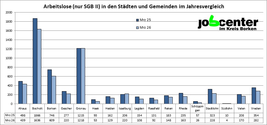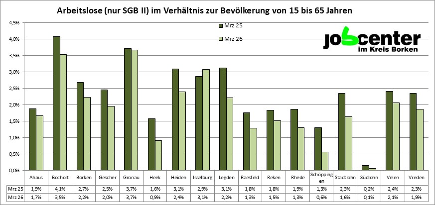 Die Zahl der SGB-II-Arbeitslosen ist im März 2026 weiter gesunken. Das teilt Landrat Dr. Kai Zwicker jetzt mit. „Der deutliche Rückgang der Arbeitslosigkeit ist ein positives Signal vor dem Hintergrund der aktuellen Entwicklungen in der Weltwirtschaft“, erklärt Dr. Zwicker. Das „Jobcenter im Kreis Borken“ weist für den Monat März 2026 insgesamt 5.745 erwerbsfähige Leistungsberechtigte aus, die als arbeitslos registriert sind. Im Vergleich zum Vormonat Februar 2026 ist die Zahl der SGB-II-Arbeitslosen damit um 110 Personen gesunken. Im Vorjahres-Vergleich zum März 2025 hat sich die Zahl deutlich um 973 reduziert. Die Quote der arbeitslosen Grundsicherungsempfänger an den zivilen Erwerbspersonen im Kreisgebiet ist im Vergleich zum Vormonat um 0,1 Prozent gesunken und liegt bei 2,5 Prozent (Februar 2026: 2,6 Prozent, März 2025: 3,0 Prozent).