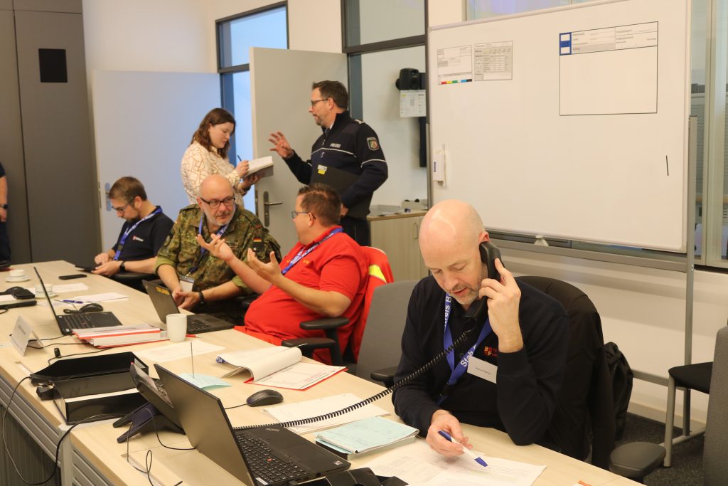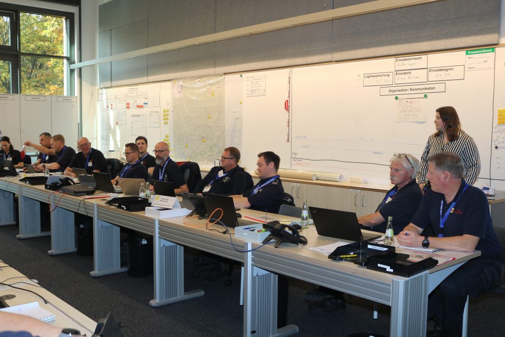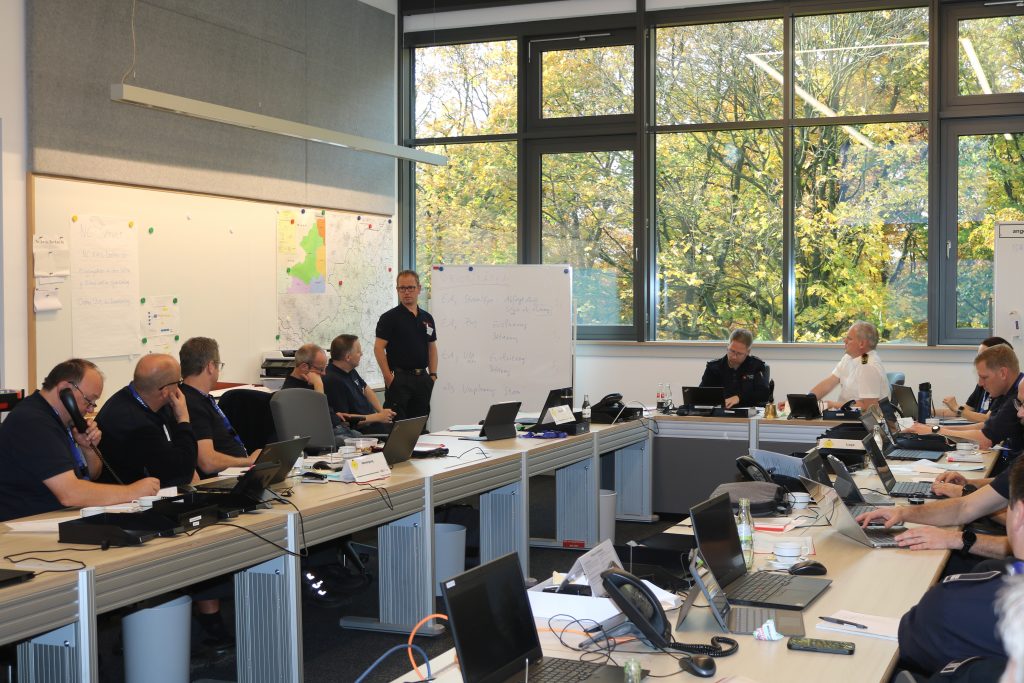 „Schneechaos im Westmünsterland, blockierte Straßen, der Strom ist weg, Verkehrsunfälle und dann steckt auch noch ein Zug mit 260 Menschen in Gronau fest“. Dieses vorgegebene Katastrophen-Szenario war ein Bestandteil der zweitägigen Stabsübung (d. h. operative Einheiten waren vor Ort nicht tätig) der Feuerwehren im Kreis Borken, die jetzt im Borkener Kreishaus stattfand. Schwerpunkte lagen dabei auf der Arbeit im Stabsraum – insbesondere mit der fortlaufend zu aktualisierenden Lagekarte, dem Zusammenwirken mit der Informations- und Kommunikationseinheit (IuK) und anderer technischer Infrastruktur – sowie auf der Kooperation mit verschiedenen Fachberatern und Verbindungspersonen, zum Beispiel vom Malteser Hilfsdienst, von der Deutschen Lebens-Rettungs-Gesellschaft und vom Kreisverbindungskommando der Bundeswehr. Außerdem wurde die generelle Arbeit innerhalb eines Stabes der Einsatzleitung geübt. „Das gleiche Übungsszenario an zwei Tagen mit zwei unterschiedlichen Teams zu üben – das liefert immer wieder neue Impulse für die Verbesserung unserer Stabsarbeit“, resümierte Kreisbrandmeister Stefan van Bömmel. „Insgesamt können wir ein positives Fazit ziehen. Viele Abläufe und Kommunikationswege haben gut funktioniert. Es war wieder eine gute Gelegenheit, das Wissen aus vorangegangenen kleineren Workshops jetzt innerhalb des gesamten Stabes einzusetzen“, ergänzte Liana Rotthues aus der Fachabteilung Gefahrenabwehr des Kreises Borken, die die Übung mit organisiert hatte. Unterstützt wurden die Organisatoren der Übung von der Firma „HCT Stabsschulung“, die sich deutschlandweit um das Thema „Arbeiten im Stab“ kümmert. Insgesamt waren an beiden Tagen 70 Personen aktiv an der Bewältigung des Übungsszenarios beteiligt: davon unter anderem 60 Feuerwehrleute aus dem ganzen Kreisgebiet und drei Fachberater sowie Verbindungspersonen des Malteser Hilfsdienstes, der Deutschen Lebens-Rettungs-Gesellschaft und der Bundeswehr.